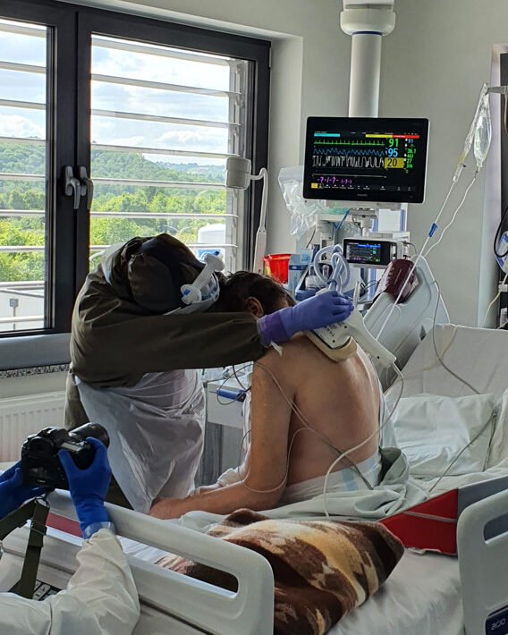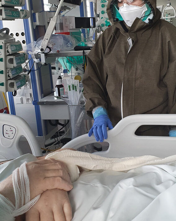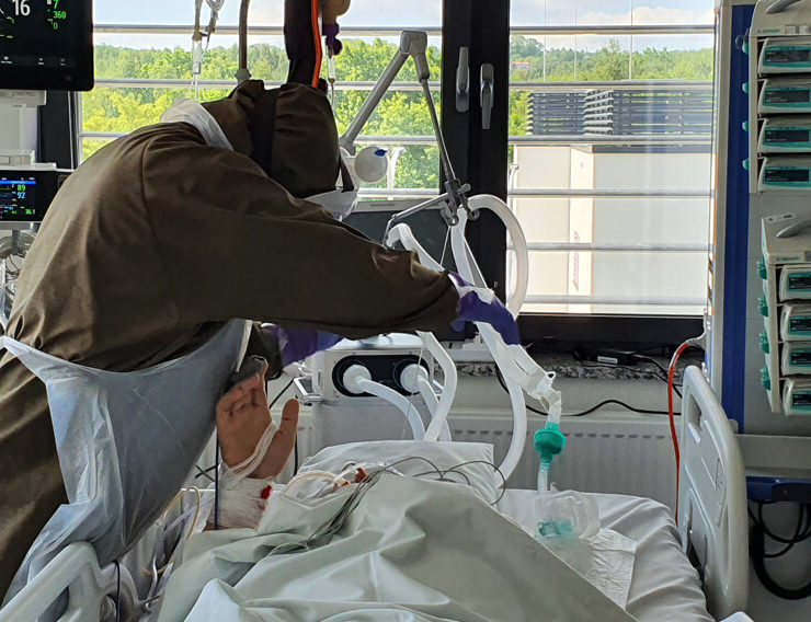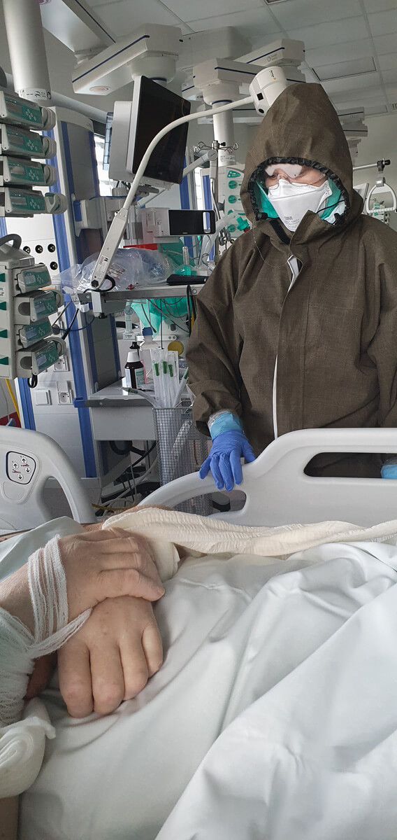 Wiadomo, że z pacjentem najdłużej jest pielęgniarka, a potem właśnie fizjoterapeuta. My, lekarze, jesteśmy obecni podczas wizyty, a jeśli potem się nic nie dzieje, to nie potrzeby, abyśmy przychodzili. A ten kontakt człowieka z żywym człowiekiem jest bardzo istotny. Szczególnie teraz. Nawet jeśli nie ma warunków do swobodnej rozmowy, bo pacjent jest zaintubowany, to jednak nawiązują ze sobą kontakt.