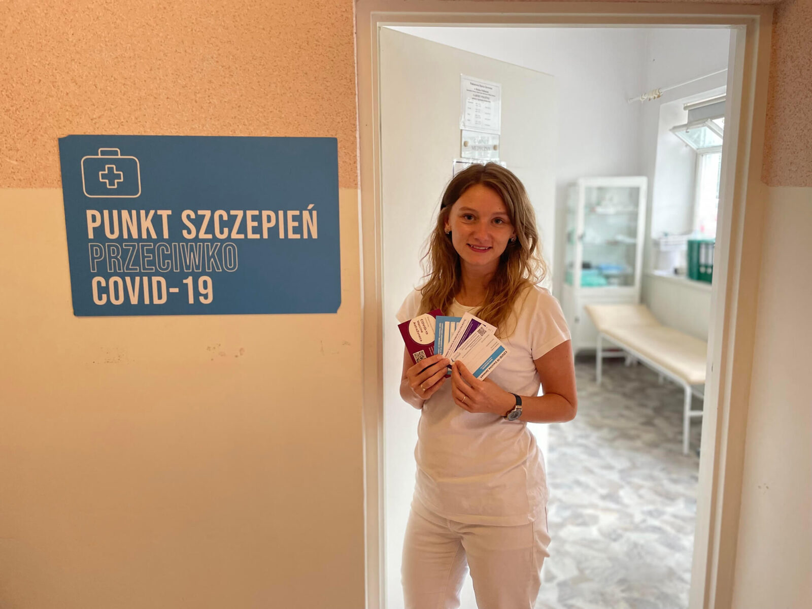 W maju br. rozpoczęłam współpracę z Punktami Szczepień Powszechnych w powiecie bielskim na Podlasiu. Początkowo odpowiadałam za punkt mieszczący się w malutkim, niespełna czterotysięcznym miasteczku. Teraz dołączyłam do zespołu w stolicy powiatu – Bielsku Podlaskim. PSP mieści się na terenie POZ przy miejskim szpitalu.