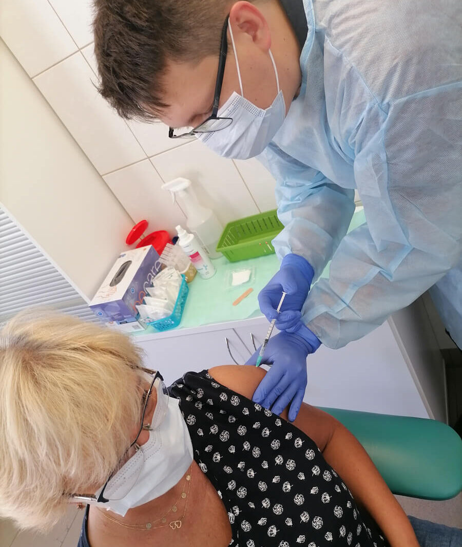 Szczepienia wykonuję w niedużej prywatnej przychodni, w której pracowałem do tej pory na stanowisku fizjoterapeuty. Z czteroosobowego zespołu fizjoterapeutów w placówce jako jedyny zdecydowałem się na odbycie szkoleń i zdobycie uprawnień w zakresie szczepień przeciw COVID-19. Do moich obowiązków należy zarówno kwalifikacja do szczepień, jak i samo wykonanie iniekcji. Dzięki zaangażowaniu pozostałego personelu przychodni wypracowaliśmy system pracy pozwalający wykonać mi te dwie złożone czynności sprawnie i z należytą starannością.