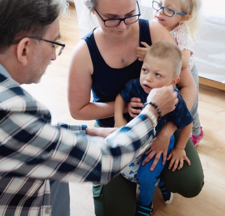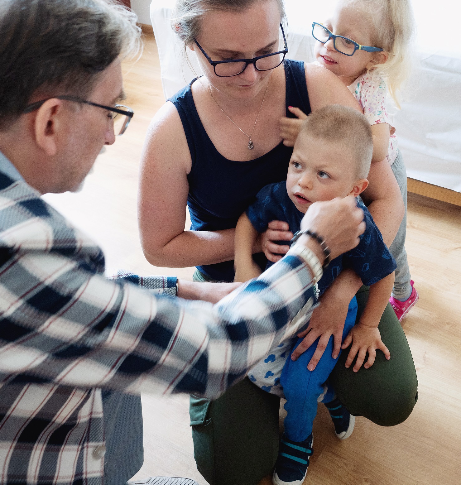 Za chorym dzieckiem stoi jego rodzina, zmęczony rodzic.